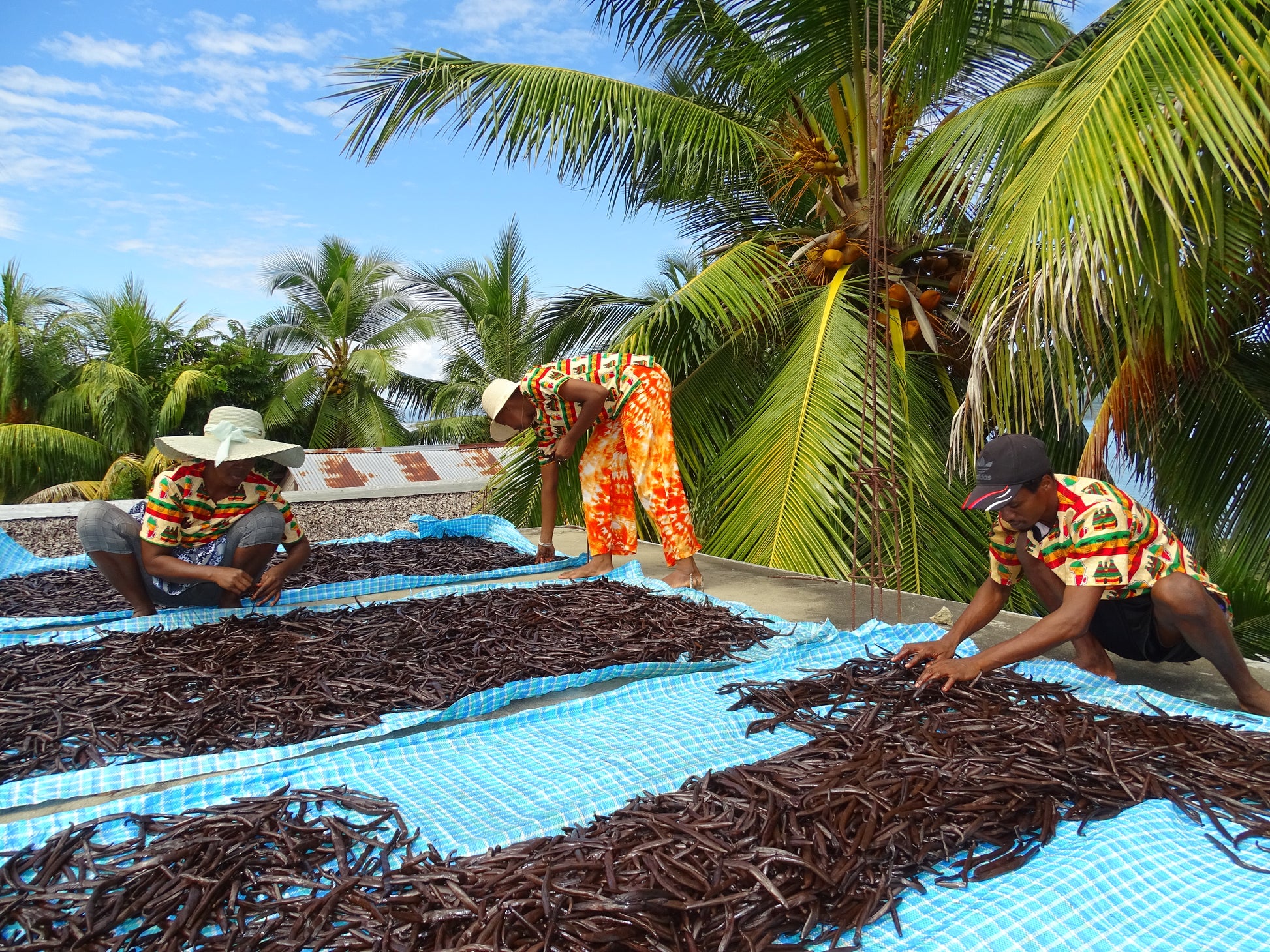 弊社では、完全かつ明確な管理(監査可能で説明責任があり、現場で実際に目に見える)を実施することで、蘭の手による受粉(「バーボン法」)から「グリーンシーズン」の成熟した鞘の切り取り、水焼き/殺菌(「ラノマファナ」)、選別(「トリアージ/較正」)、日光当て、硬化ウィンドウのスケジュール設定、ワックスペーパーでの梱包に至るまで、蘭の生涯と経過を通じて風味、形状、バニリンの発達を最適化し、社内の輸出ライセンスと小規模な研究所とともに島から出荷します。