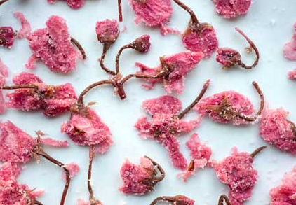 開花時に摘み取られる桜は、濃いピンク色で香りもよいです。硬い部分や傷んだ部分を取り除いて、品質の高い桜を厳選しています。