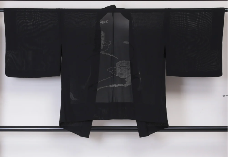 洗練された雰囲気を漂わせる黒のシルク着物ジャケット、夏羽織で夏を迎えましょう。ダブルガーゼで仕立てられており、暖かい日にぴったりの透け感があります。細かいドットで表現された繊細な貝殻の樽模様が芸術的な雰囲気を添えています。