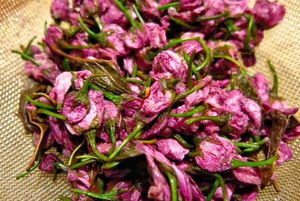 After harvesting, sakura cherry blossoms are preserved by pickling them with salt and plum vinegar. This helps to keep their pink color which lasts for a long time. Each flower is carefully preserved and processed to maintain its shape, aroma, and beautiful petals.